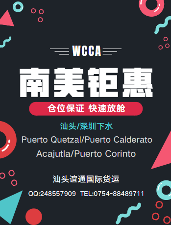 汕頭,澄海,潮陽,濠江,潮州,潮安,揭陽,普寧等潮汕地區(qū)裝柜,汕頭/深圳港到Puerto Quetzal/Puerto Calderato/Acajutla/Puerto Corinto等港口國際海運(yùn)航線,更多港口航線,歡迎來電咨詢。